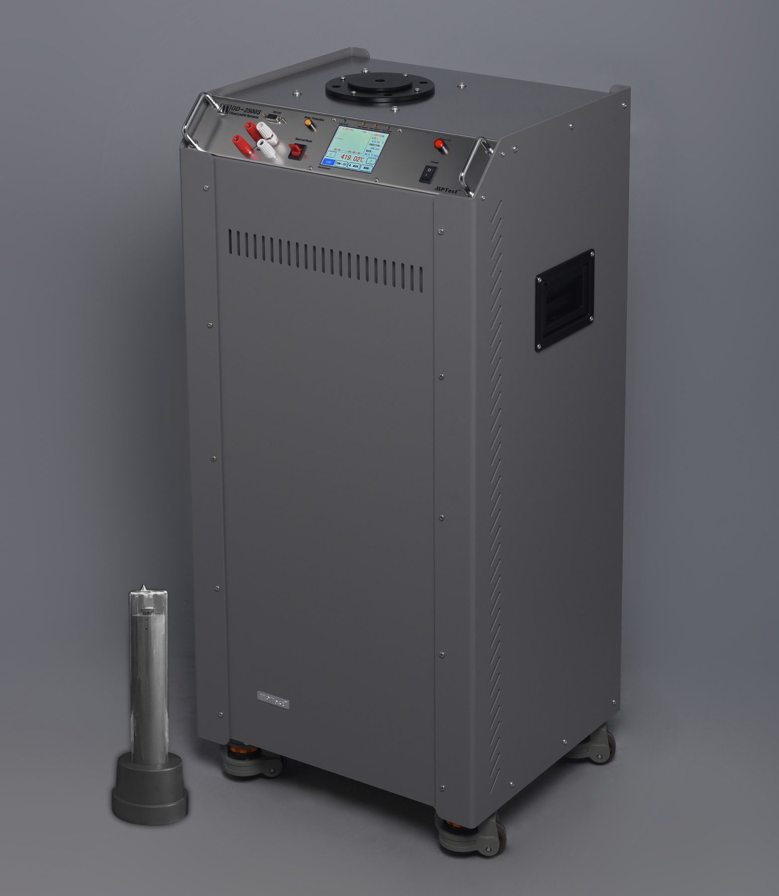 Mptest specializes in the manufacture of fixed-point cells and realization apparatus for temperatures defined by the ITS-90. The GD-2500S is a realization apparatus specifically designed for the zinc freezing point. This system features a temperature control stability of ±0.02 °C and is equipped with a bath boasting an aperture of 63.5 mm. The temperature controller incorporates a color touchscreen interface, which allows for the input of Standard Platinum Resistance Thermometers (SPRTs) and provides a real-time curve display for observing the temperature plateau. It also includes a rate-controlled heating/cooling function to prevent excessively fast temperature ramps. The bath employs a metallic construction paired with a heat-transfer sleeve to ensure optimal thermal conductivity. This key design effectively suppresses overheating, thereby safeguarding the valuable fixed-point cell and ensuring the integrity of its performance.