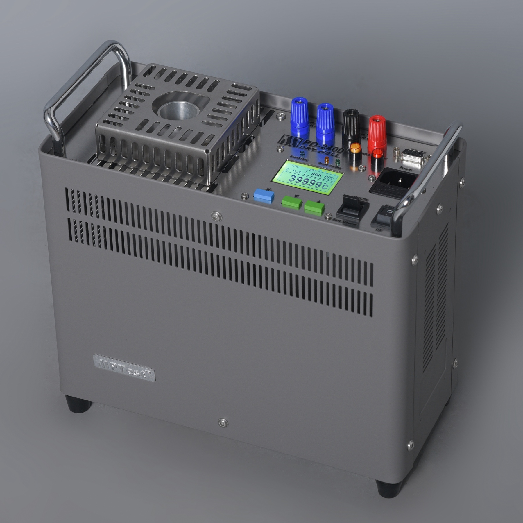 The PD-2400 is a compact, portable, and economical dry-well temperature calibrator designed for medium-temperature applications. The unit features a conical heating block and heat transfer sleeves, which provide excellent thermal conductivity while effectively preventing foreign object jamming. It can be powered by a 24V lead-acid battery and comes standard with a portable carrying case. With a sales history spanning over 20 years, its reliability has been thoroughly proven through long-term use. The calibrator offers a temperature range from 50°C (122°F) to 400°C (752°F), temperature stability of ±0.02°C per 10 minutes, and a well depth of 160 mm (6.30 inches). Customized heat transfer sleeves can be machined to accommodate specific thermometer diameters.