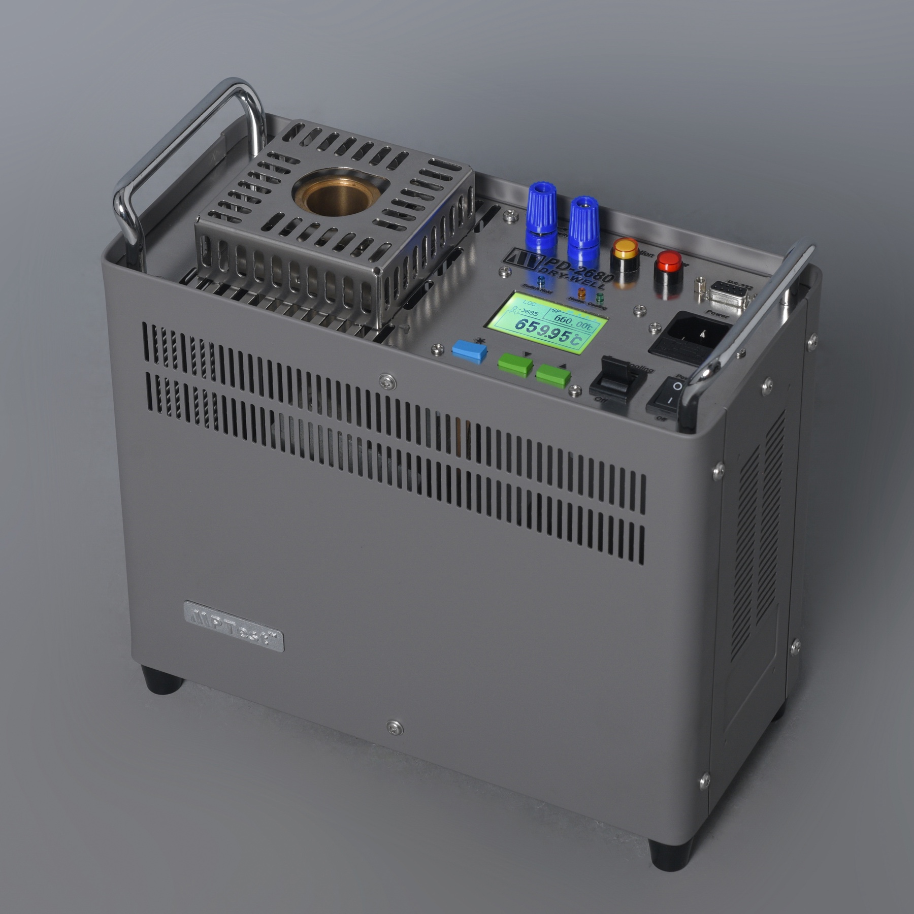 The PD-2680 is a compact, portable, and economical dry-well temperature calibrator designed for high-temperature applications. It features a conical heating block and heat transfer sleeves. The large end of the heating block has a diameter of 25.4 mm (1.0 inch) and is manufactured from a high-temperature copper alloy that resists oxidation at temperatures up to 680°C (1256°F). This product comes standard with a portable carrying case and has a sales history spanning over 20 years, demonstrating proven long-term reliability. The calibrator offers a temperature range from 50°C (122°F) to 680°C (1256°F), with a temperature stability of ±0.03°C per 10 minutes, and a well depth of 160 mm (6.3 inches). Custom machining of thermometer bore diameters in the heat transfer sleeves is available upon request.
