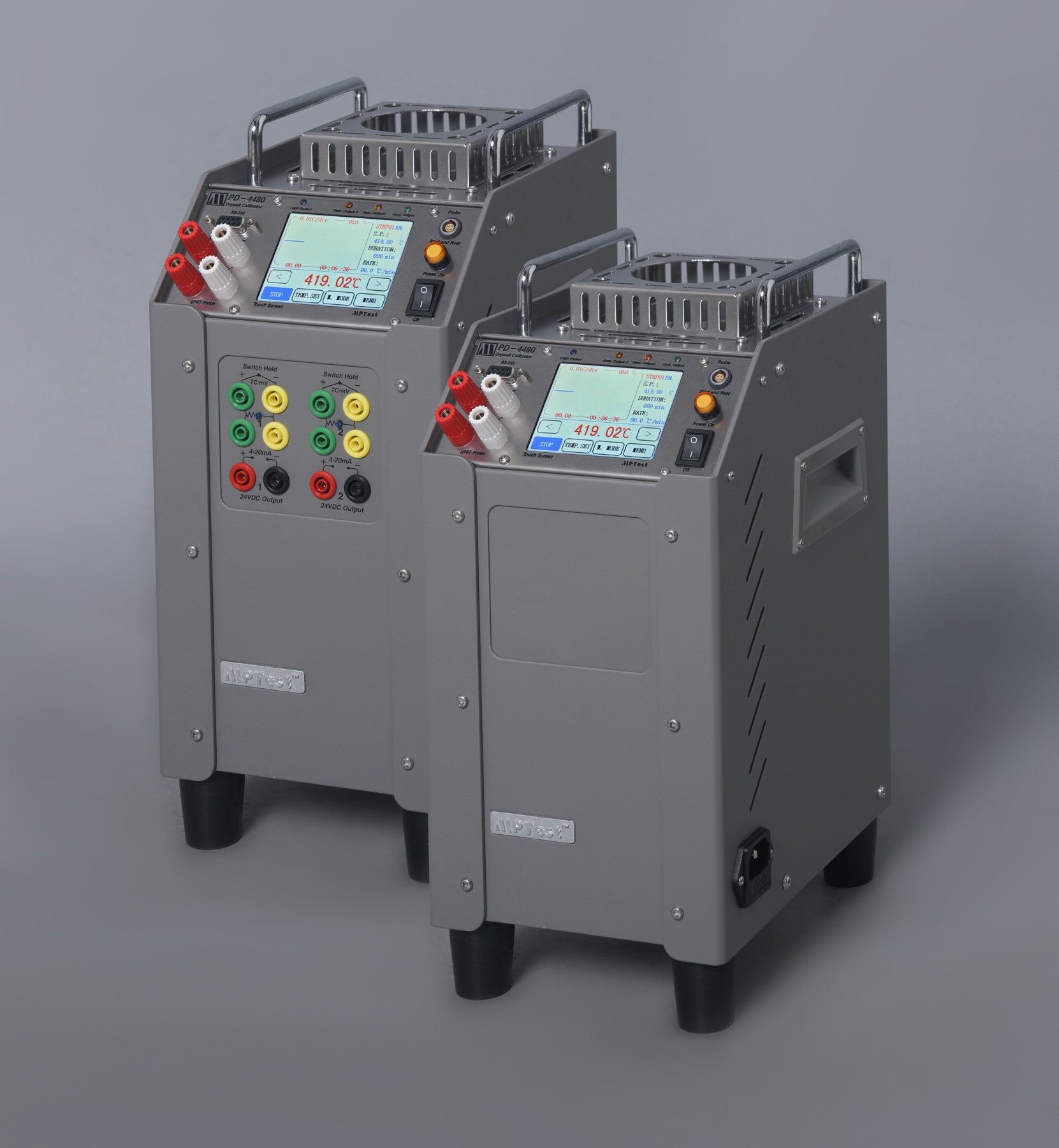 The PD-4480 is a large-aperture medium-temperature dry-well calibrator utilizing electric heating rods, achieving a temperature range of 50°C (122°F) to 450°C (842°F). Featuring a cylindrical well design with a diameter of 63.5 mm (2.5 inches) and a depth of 200 mm (7.87 inches), it offers interchangeable heat-transfer sleeves for versatile applications. The calibrator delivers a temperature stability of ±0.02°C per 10 minutes, with parameters displayed on a color touchscreen supporting multi-segment programmable temperature control. Additionally, a dual-channel electrical measurement module is available as an optional accessory. The unit includes a protective carrying case as standard.