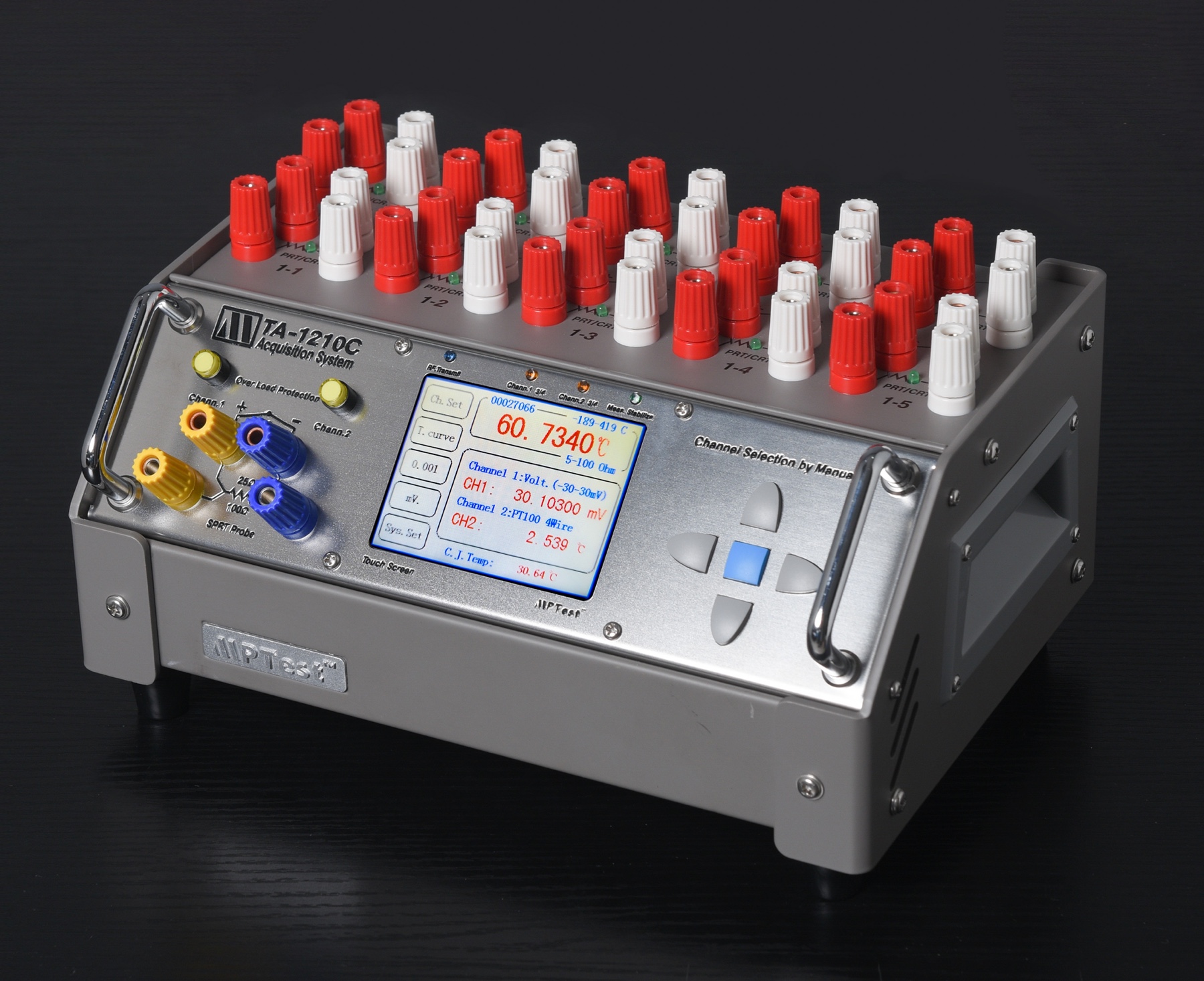 This temperature measurement and data acquisition device features 10 test channels and one reference temperature channel. It offers high 8-digit display resolution, curve display functionality, a built-in thermostatic unit, and a color touchscreen human-machine interface. The device supports 2-wire, 3-wire, and 4-wire resistance temperature detectors (RTDs) and thermocouples across its test channels, with multiple thermocouple cold junction compensation methods. It enables automated testing via RS-232 computer connectivity. Application: Automated acquisition and testing of industrial thermometers.